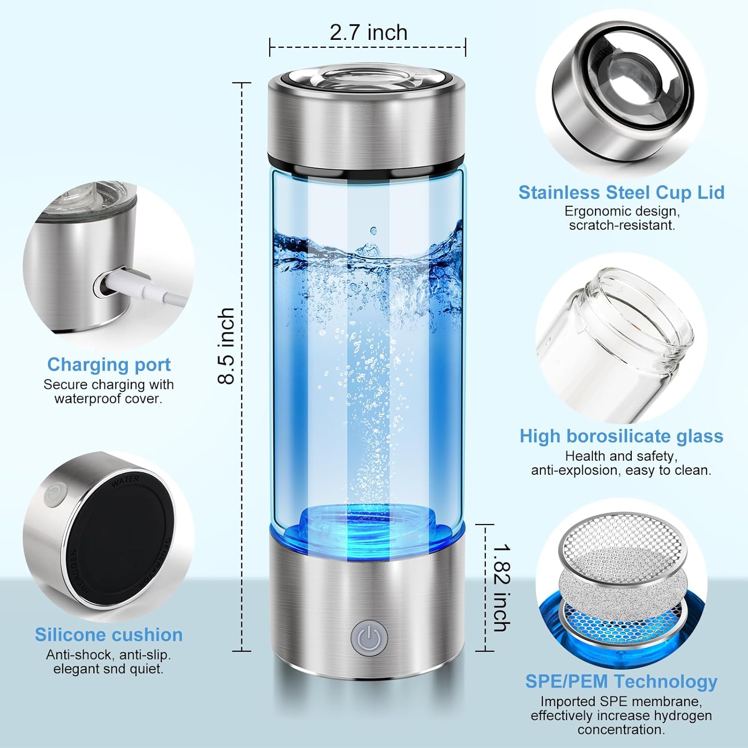 Experience smarter hydration with this 420ml hydrogen-rich water cup. Made from high borosilicate glass and equipped with a titanium-quality filter, it produces fresh hydrogen water in just 3 minutes. Regular use helps boost metabolism, improve nutrient absorption, support healthy skin, and promote better overall wellness. Compact, USB-rechargeable, and safe for daily use — your portable path to healthier living.